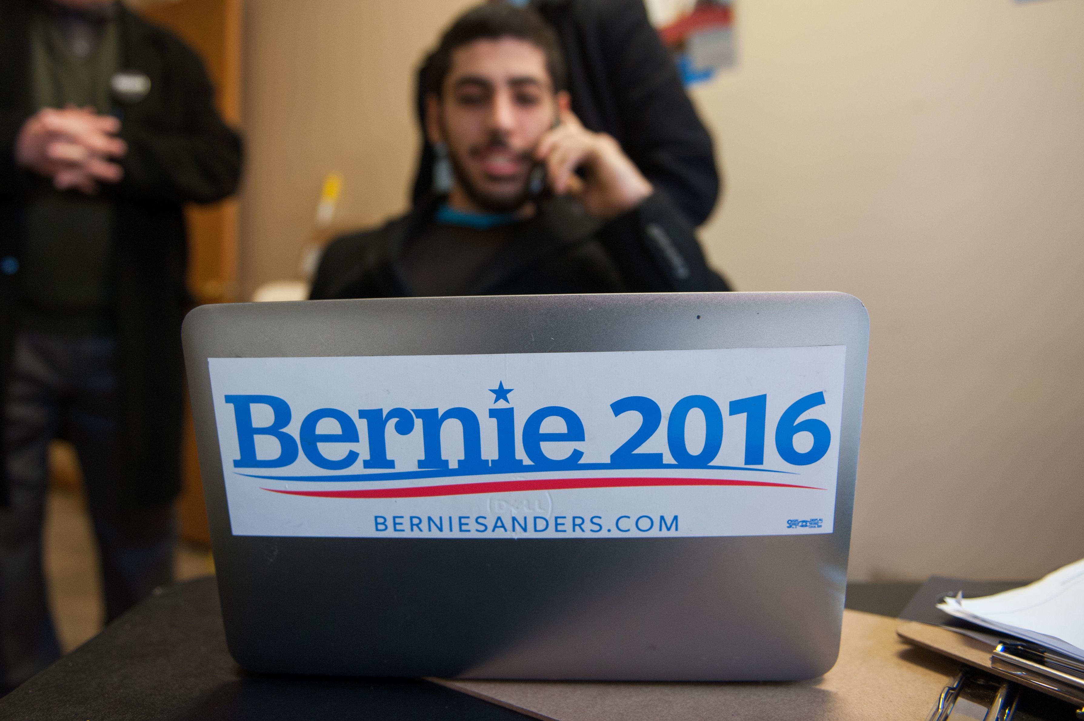 Volunteers make phone calls at the campaign field office of Democratic presidential candidate Bernie Sanders on January 31, 2016 in Fort Madison, Iowa, one day before the state’s much anticipated February 1st caucus.