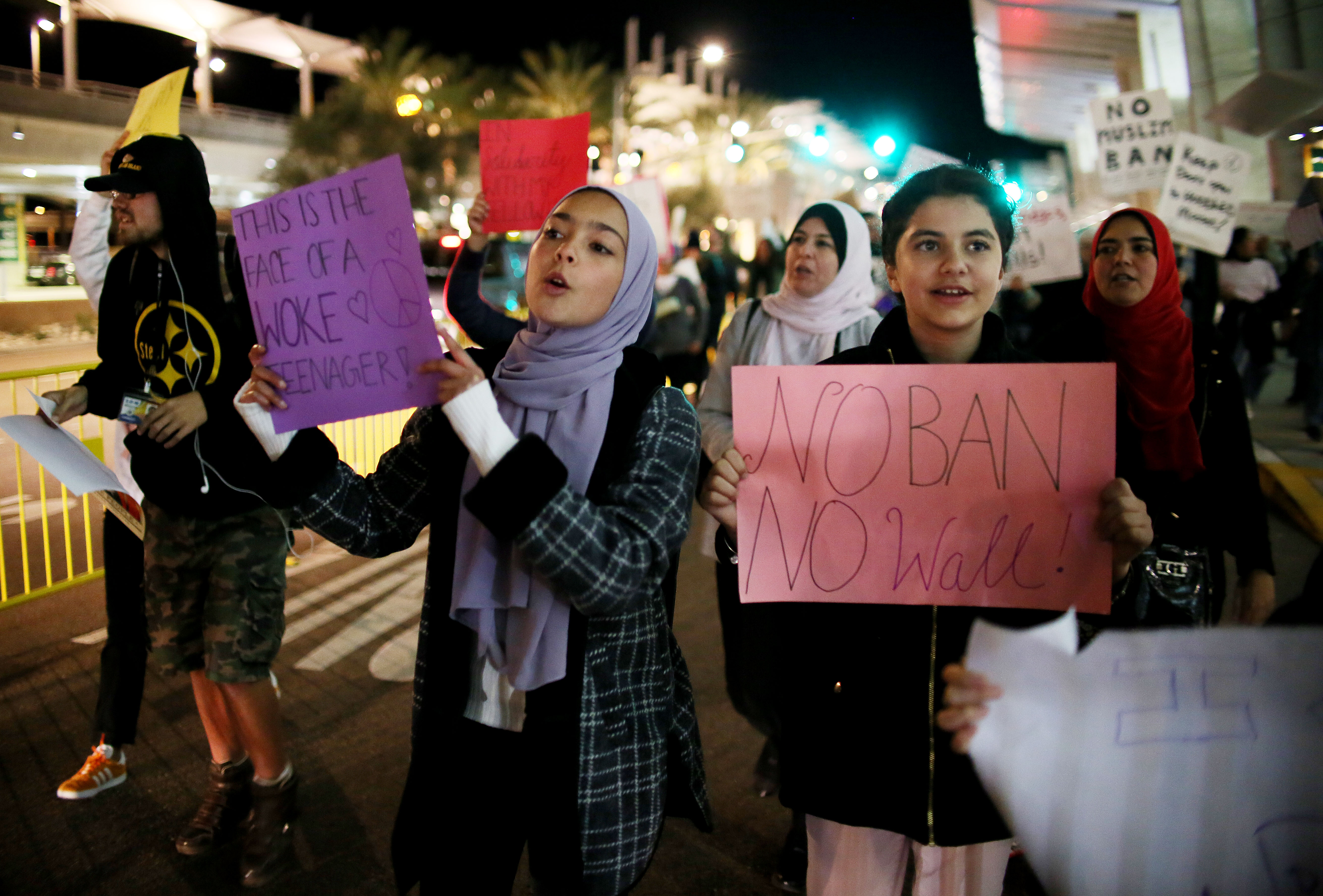 Protesters chant during a rally against the Trump travel ban at the San Diego International Airport on Monday, March 6, 2017. (Photo by Sandy Huffaker/AFP/Getty Images)