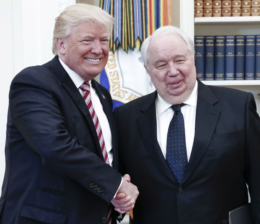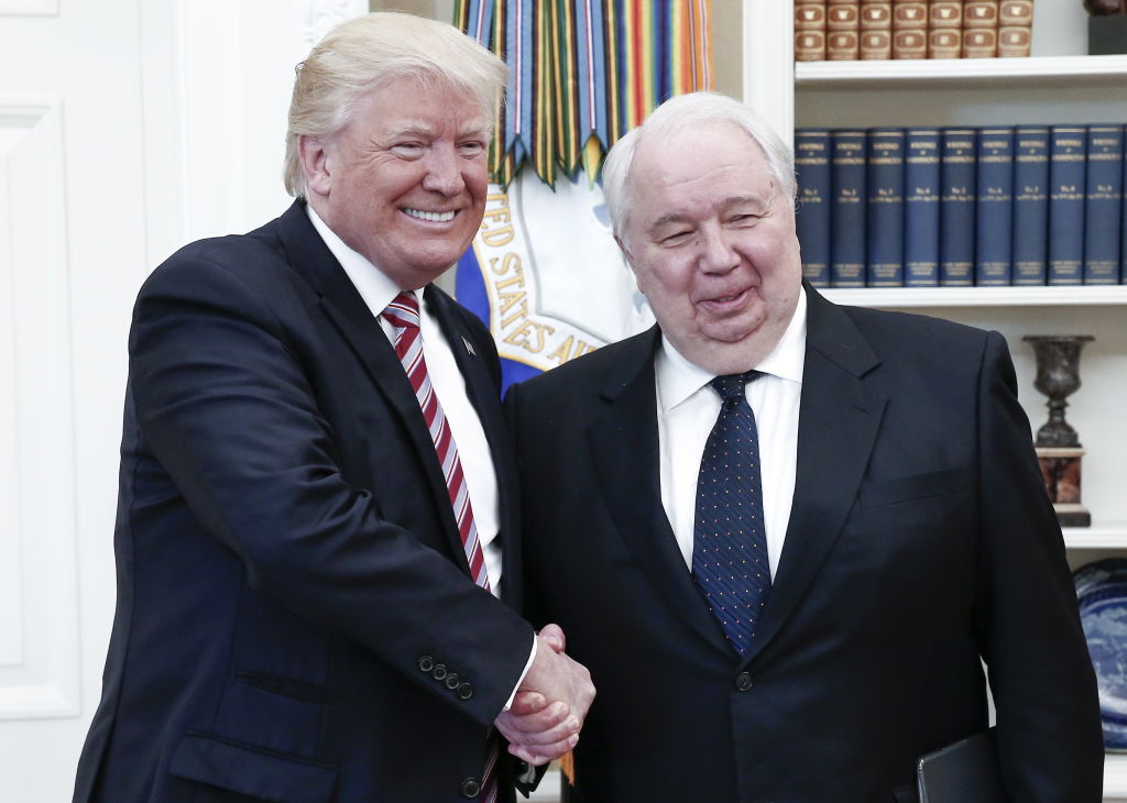 WASHINGTON, D.C., USA – MAY 10, 2017: US President Donald Trump (L) shakes hands with Russian Ambassador to the United States Sergei Kislyak during talks with Russia’s Foreign Minister Sergei Lavrov (not inpicture) in the Oval Office at the White House. Alexander Shcherbak/TASS (Photo by Alexander ShcherbakTASS via Getty Images)