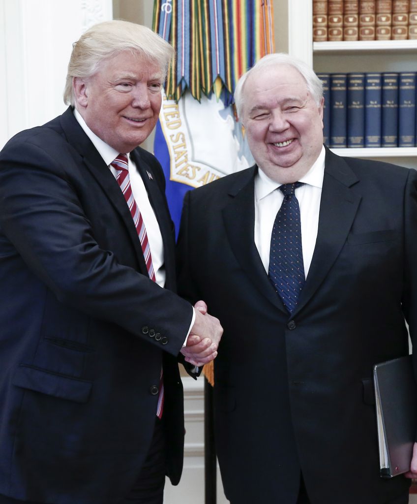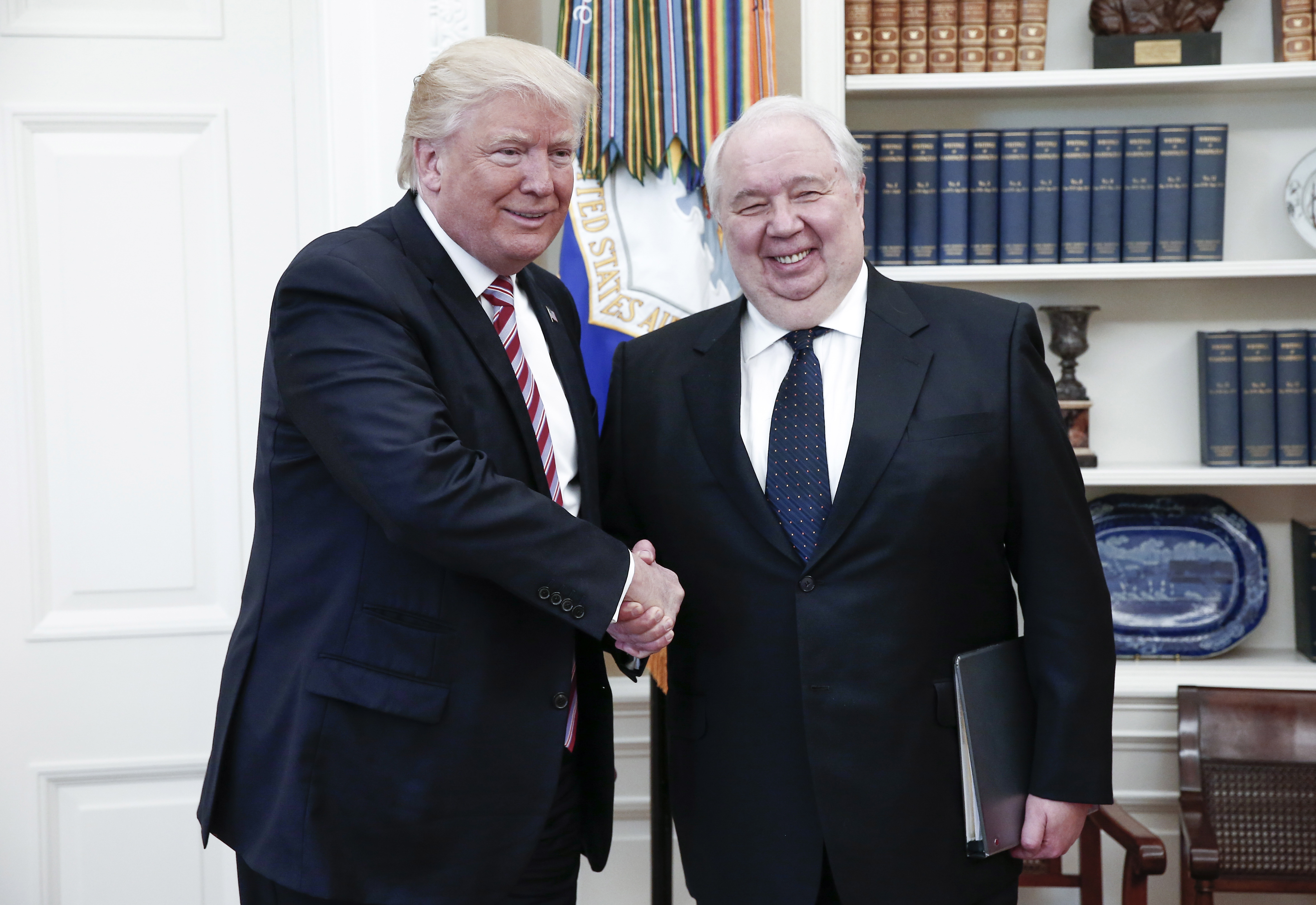 WASHINGTON, D.C., USA – MAY 10, 2017: US President Donald Trump (L) shakes hands with Russian Ambassador to the United States Sergei Kislyak during talks with Russia’s Foreign Minister Sergei Lavrov (not in picture) in the Oval Office at the White House. Alexander Shcherbak/TASS (Photo by Alexander ShcherbakTASS via Getty Images)