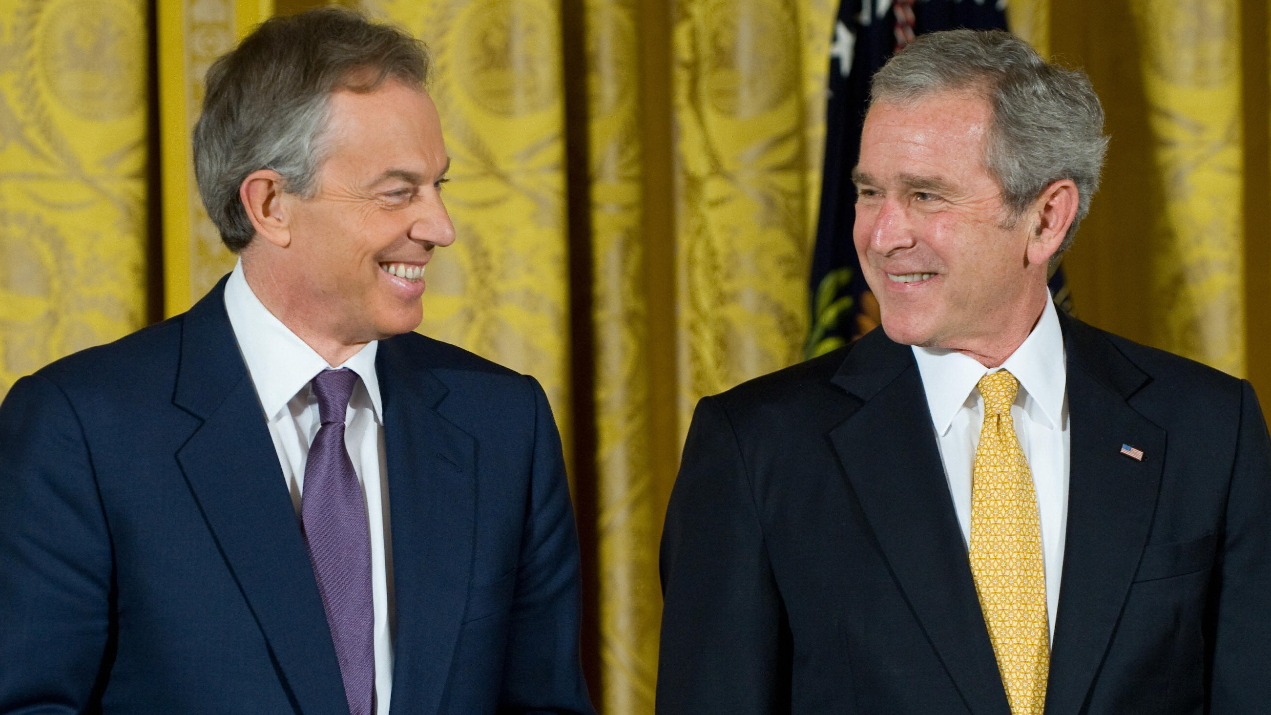 US President George W. Bush smiles alongside former British Prime Minister Tony Blair (L) prior to presenting him with the Presidential Medal of Freedom in the East Room of the White House in Washington, DC, January 13, 2009. The award, the highest US civilian award, was also presented to Australia’s former Prime Minister John Howard and Colombian President Alvaro Uribe. AFP PHOTO / Saul LOEB (Photo credit should read SAUL LOEB/AFP/Getty Images)
