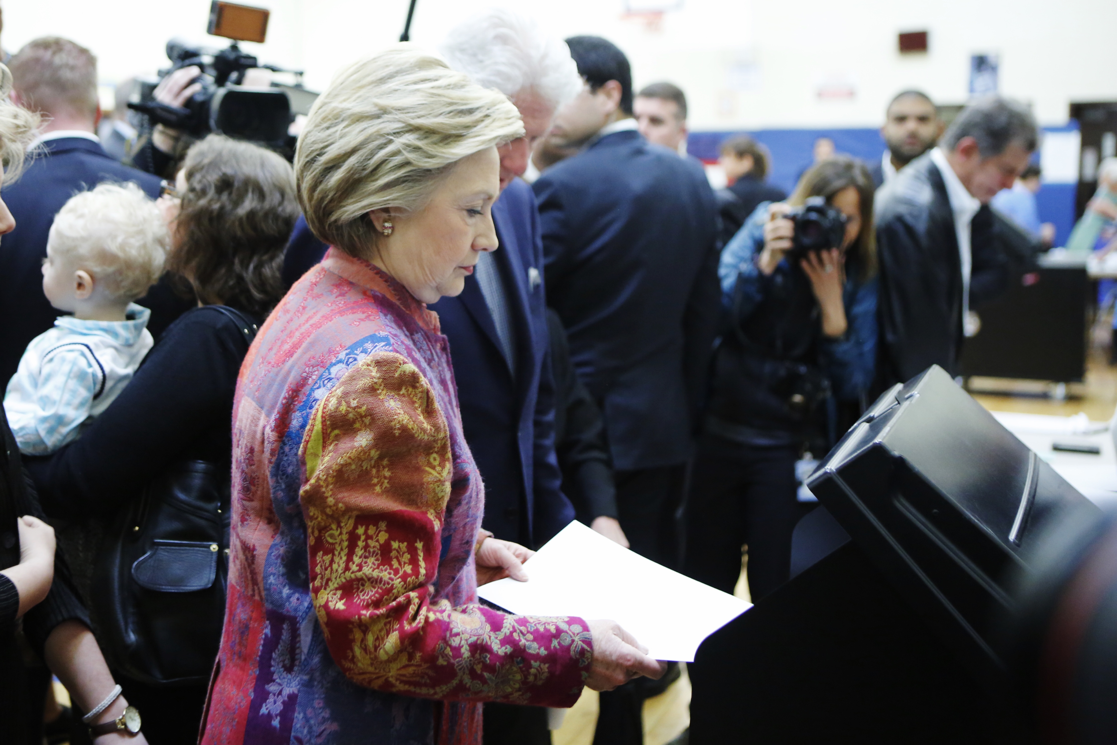 Democratic presidential candidate Hillary Clinton casts her ballot at a polling station during the New York State presidential primaries on April 19, 2016 in Chappaqua, New York. / AFP / EDUARDO MUNOZ ALVAREZ (Photo credit should read EDUARDO MUNOZ ALVAREZ/AFP/Getty Images)