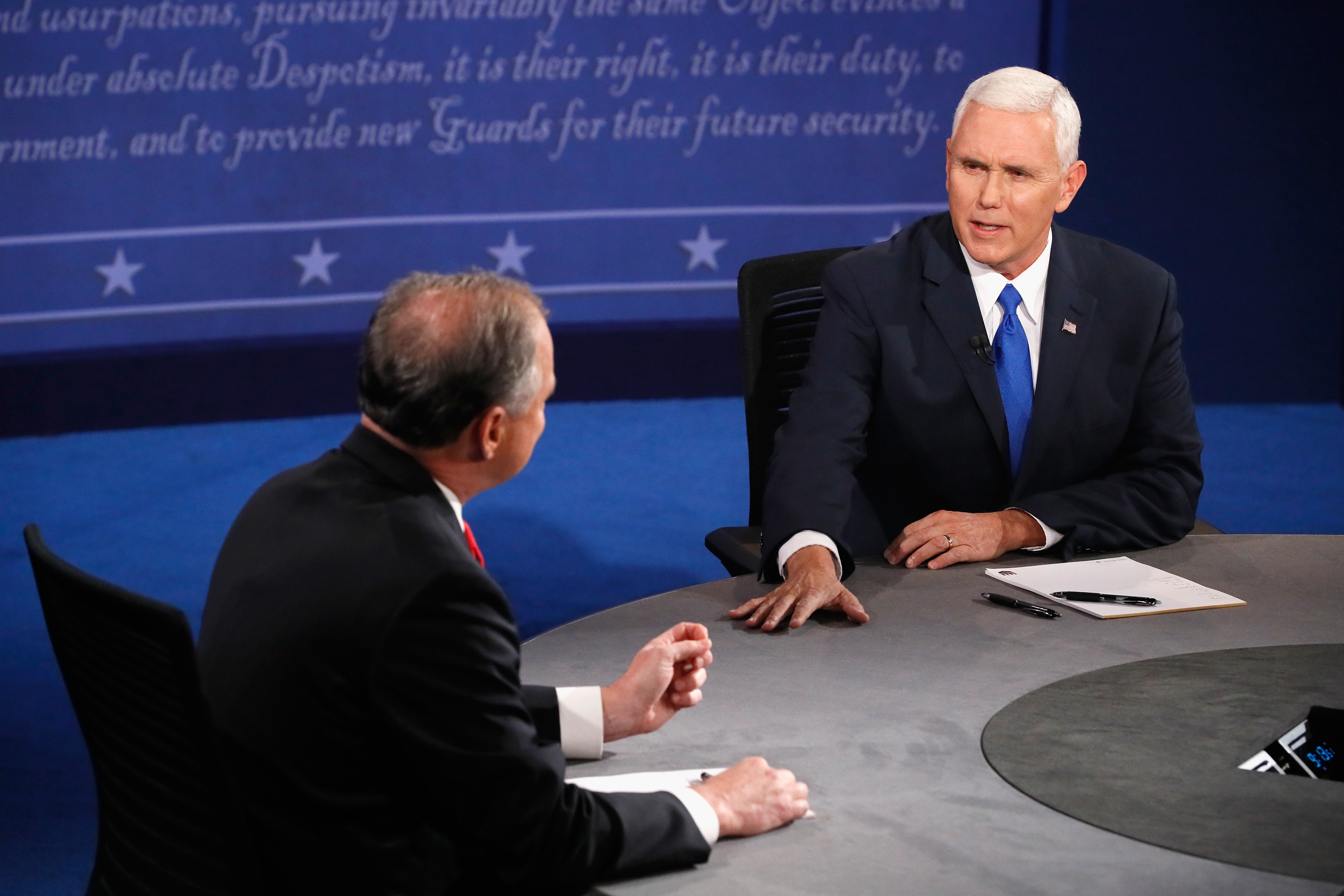 FARMVILLE, VA – OCTOBER 04: Democratic vice presidential nominee Tim Kaine (L) and Republican vice presidential nominee Mike Pence (R) debate during the Vice Presidential Debate at Longwood University on October 4, 2016 in Farmville, Virginia. This is the second of four debates during the presidential election season and the only debate between the vice presidential candidates. (Photo by Andrew Gombert – Pool/Getty Images)
