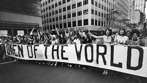 At the intersection of Fifth Avenue and 53nd Street, a large group of women hold a banner that reads ‘Women of the World’ at the Women Strike for Equality demonstration, New York, New York, August 26, 1970. Tens of thousands of women (and men) marched along Fifth Avenue towards Bryant Park to demand equal opportuntity in employment and social equality. (Photo by Michael Abramson/The LIFE Images Collection/Getty Images)